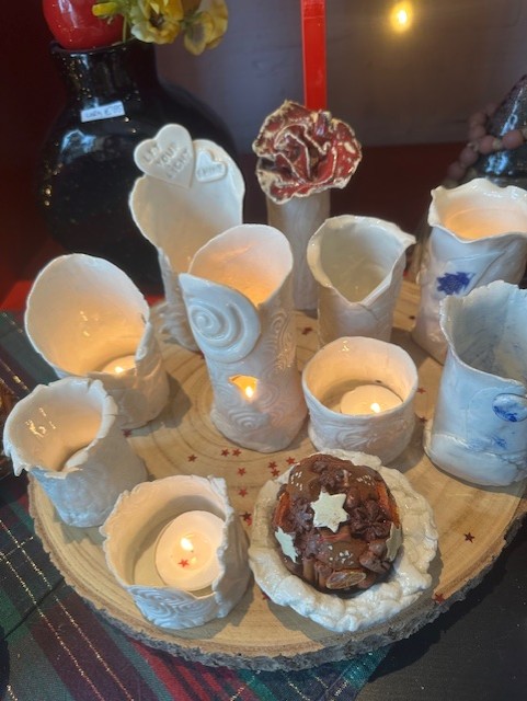 Mooie theelichthouders gemaakt van porseleinklei. Als je er een kaarsje in brandt dan zijn ze doorzichtig. Prijs tussen €7,50 en €10 per stuk.