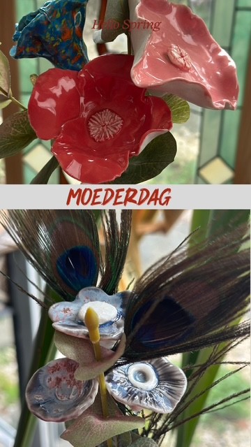 Voor moederdag en elke dag, deze mooie boeketjes met porseleinen bloemen uit eigen atelier. Geen enkel boeket is dan ook hetzelfde. De bloemen worden gecombineerd met pauweveren en/of eucalyptus. Ze kosten, afhankelijk van de grootte en hoeveeheid van de bloemen tussen de €10 en €20 per boeketje.