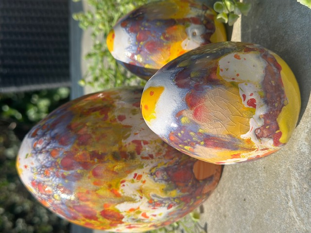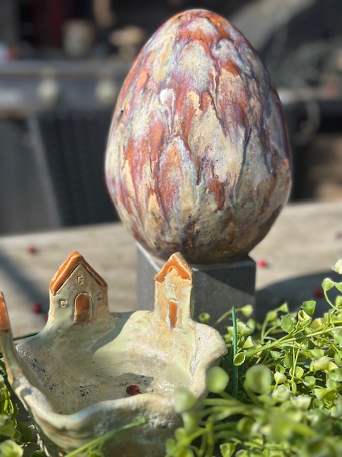 Paaseieren van keramiek hebben we in diverse soorten en maten. Hierboven en hieronder zie je er een paar maar er zijn er meer. Bezoek rustig onze tuin en bekijk ze op onze tuintafel. Prijzen variëren. De set hierboven kost als geheel €80 maar ze kunnen ook per stuk verkocht worden. Het ei hieronder is wintervast dus kan de hele winter een mooie plaats in je border innemen. Dat kost €25. Het mooie bakje met de huisjes kost €17,50.