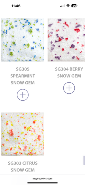 Sinds enige tijd is ook snowfal leverbaar met kleurspikkeltjes: de snow-gems. In 3 kleuren en €8 per potje va 118 ml.