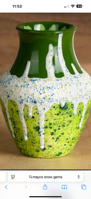 foto hierboven: snowfall glaze kan ook hooggestookt worden, zoals te zien is op dit vaasje. Hier is nog een flink met water verdund laagje blauwe stroke&coat over de snowfall gezet.